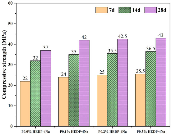 Investigating the impact of varying HEDP·4Na concentrations on the mechanical performance of alkali-activated pastes, the compressive strength of the specimens (20 mm× 20 mm × 20 mm) was measured at specific curing ages under compression, with a loading rate of 0.42 kN/s. The compressive strength values were averaged from the three specimens.