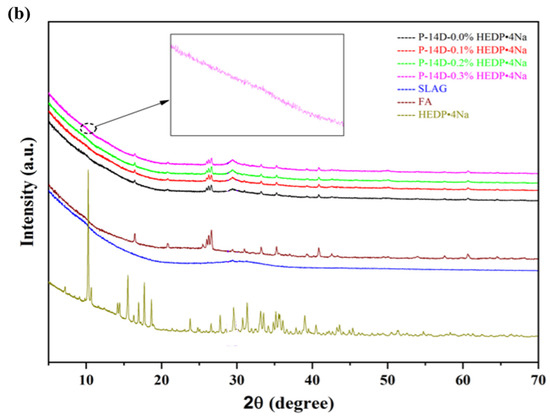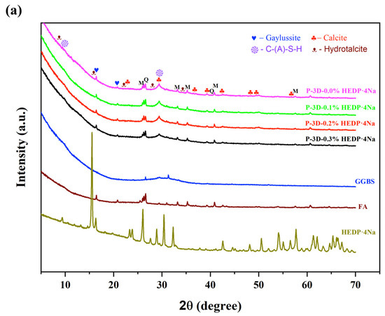 Mineralogical phases from unreacted FA, such as quartz and mullite, were observed in the diffraction curves of all alkaline-activated pastes at different curing ages, as shown in Figure 8. The reaction between FA/GGBS and the alkaline activator led to the formation of partially crystalline phases from amorphous phases. The main hydrated phases detected by XRD included a poorly crystalline C-(A)-S-H phase and a low-intensity peak of hydrotalcite (HT), formed through the alkaline activation of slags [57,58]. Calcite was detectable in the testing samples as well. With the incorporation of HEDP·4Na content, slight variations in the hydration products at different stages of the curing process were observed. The retarding formation of crystallinity was significantly influenced by the addition of HEDP·4Na, which was also verified by a calorimetry test. Similar phenomena have been reported in the literature [59,60]. Amorphous phases constitute the majority of AAFS reaction products, making it difficult to quantify C-A-S-H and N-A-S-(H) content individually. However, their content and distribution in the AAFS system were related to the properties of AAFS.