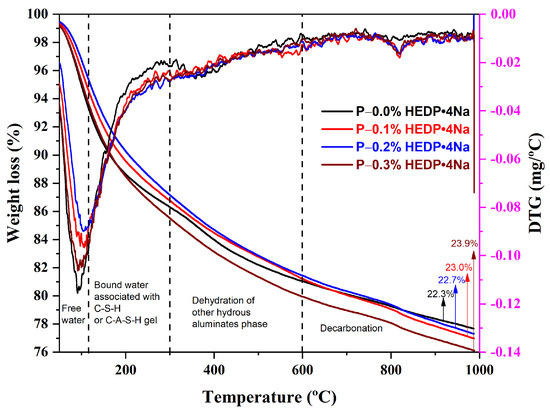 Figure 9 displays the TGA results for AAFS paste at 28 days. The mass loss during the measurement period was evaluated within the temperature range of 30–1000 °C, varying between 22% and 24%. The AAFS mixture made with 0.3% HEDP·4Na in total weight loss showed the highest mass loss compared to the other AAFS mixtures. A significant amount of weight loss can be observed at temperatures up to 300 °C due to the evaporation of water. Specifically, the mass loss percentages for the AAFS pastes, containing HEDP·4Na in concentrations ranging from 0.0% to 0.3%, were 13.5%, 13%, 12.5%, and 14.5%, respectively. This was because the water molecule is weakly bonded and escapes from the sample during this initial phase (between 30 and 100 °C). The material structure started to deteriorate due to the shrinkage of AAFS paste beyond this temperature, and mass loss was caused by the non-structurally bonded water in C-S-H or (C-A-S-H) in the second phase (from 100–300 °C) [55,61]. It can be observed that the mass loss of AAFS pastes with the addition of HEDP·4Na was slightly higher than that of the paste without HEDP·4Na, corresponding to the greater formation of hydration products. A precipitated Ca-phosphonate nanoparticle seeding effect and a more homogeneous hydration process may be also responsible for this [39]. When temperatures rose above 300 °C, the hydroxy groups began to dihydroxylate slowly. Relative dimensional stability was apparent in the material after removing most of the water. After being heated to 1000 °C, the mass loss corresponded to the decarbonization of the carbonate phase. In the future, the use of HEDP·4Na may have a beneficial influence on the properties of AAFS paste.
