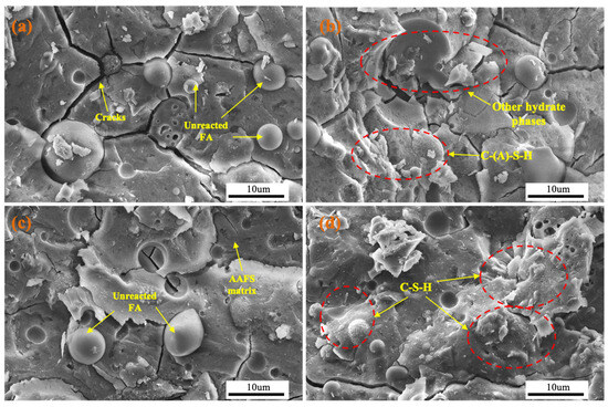 At the early stage, the dissolution reaction mechanism occurs when the AAL dissolves some of the outer shells of the FA and GGBS particles in the process. This process leads to the leaching of Si-O-Al materials, which then form a cross-linked polyhedral polymer [62]. As observed in Figure 10, this polymer establishes a stable and three-dimensional structure. The unreacted and partially reacted FA particles can be seen in Figure 10. The reason was that smaller FA particles are more activated than larger ones. Activation and consumption were easier for finer particles than for coarser particles, which may be due to their easier absorption and more efficient conversion [63]. In contrast to FA, GGBS particles were solubilized during the alkaline activation, which was attributed to their higher vitreous phase content [63,64]. When the solubilization of FA and GGBS particles is poor, it might cause an insufficient amount of gel formation. Furthermore, it hinders the development of the compressive strength of AAFS paste [65]. Figure 10 demonstrates that the addition of HEDP·4Na leads to a denser microstructure in the AAFS matrix compared to samples without its addition. This may be attributed to its retardation effect and the influence of phosphonate on the degree of crystallinity. The use of HEDP·4Na was also elucidated to enhance the compressive strength of AAFS paste.