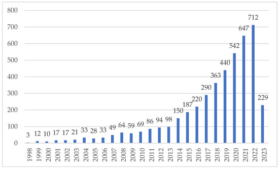3 OTE research papers from 1998 to 2023, and the total number of studies represents an increasing trend year by year. Scholars have shown a great interest in OTE research. Based on the papers we found, the progress in research on the OTE was categorized into the following three phases: (1) The initial phase (1998–2006): the number of papers published in this phase was generally low, with an average of no more than 20 papers per year in the first five years, and only 174 papers were included, accounting for 3.89% of all papers. (2) The development phase (2007–2013): the papers published in this period revealed a fluctuating and increasing stage, with a total of 519 papers being published, indicating that scholars had begun to pay attention to relevant research on the OTE. However, the level of research in this stage was still shallow, and the maximum number of annual publications did not exceed 100. (3) The rapid development phase (2014–2023): the number of annual publications of papers exceeded 100 in 2014 and entered a sustained rapid development phase, peaking in 2022, indicating that the study of OTE had begun to become an important topic. As of 9 June 2023, 229 papers have been published, and the annual number of publications is predicted to have continued to increase in 2023.