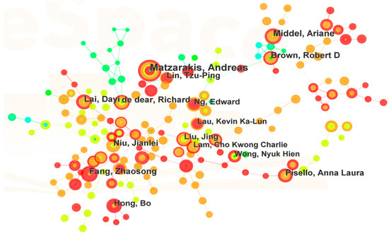 Table 1 lists the top 10 authors with the highest publication frequency, among which, Andreas, Matzarakis has published 44 papers, followed by, Ariane, Middel (27), Richard, de dear (26), Dayi Lai (24), and Zhaosong Fang (24).