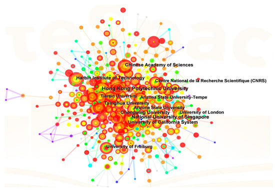 The institutional collaboration network in the literature was analyzed by CiteSpace, with the node type “institution” and the slicing pruning “pathfinder”, obtaining network mapping (
