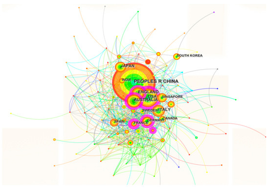 Using CiteSpace with the node type “country” and the slice pruning effect “pathfinder” to analyze the number and centrality of literature published in different countries, a network map (