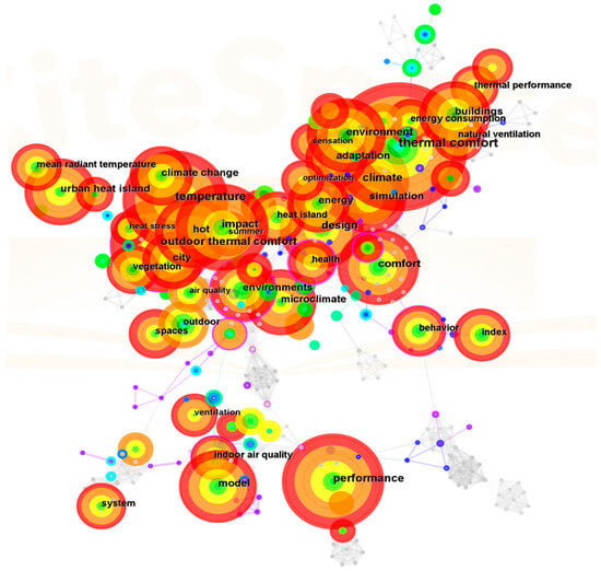−2. The high-frequency keywords, such as thermal comfort, environment, climate, design, adaptation, outdoor thermal comfort, temperature, vegetation, index, impact, microclimate, environments, climate change, spaces, etc., are densely distributed in the center of the map, and the clusters are closely connected internally and show complex intertwined connectivity externally, which reflects the concentration and connectivity of research hotspots in the field of OTE.