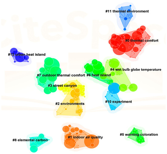 −1 (S > 0.7), indicating that the clustering is effective and persuasive. The network mapping generated a total of 59 clusters, from which we selected the top 12 clusters, including #0 thermal comfort, #1 indoor air quality, #2 environment, #3 street canyon, #4 wet bulb globe temperature, #5 warning coloration, #6 heat island, #7 outdoor thermal comfort, #8 elemental carbon, #10 experiment, #11 thermal environment, and #12 urban heat island, which cover the major research topics in the OTE field.