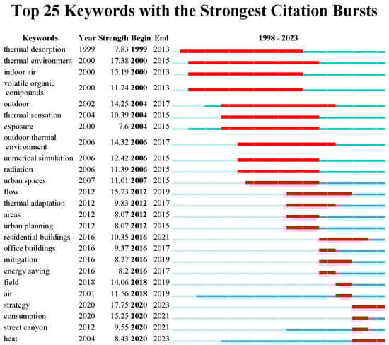 (1) 1998–2003: This period is in the initial stage of exploring the field of OTE, mainly focusing on the quality of the thermal environment, including the indoor thermal environment. The field of the OTE was explored from the aspects of indoor air, heat adsorption, thermal environment, particulate matter, etc., with the keywords having a high burst intensity and burst duration of 10 years or more. The IPCC has pointed out that human activities have had a significant impact on the OTE since the establishment of the IPCC in 1988. The increasing amount of greenhouse gases in the atmosphere has led to a continuous rise in global temperatures, threatening human health and living spaces. The quality of the thermal environment due to the greenhouse effect has attracted a great deal of attention from researchers and scholars during this period, and the relevant research has been aimed at improving the quality of the indoor and outdoor thermal environment to provide a comfortable living environment for human beings.