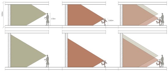 From a practical point of view, the human scale defines the amount of available information within the viewer’s visual field. An example of the differences based on the viewers’ scale is presented in Figure 2. In the first row of sketches, the room’s dimensions are the same in all three sketches, and the variable is the viewer’s height. The first sketch depicts an adult of 1.70 m in height, while a child of 0.70 m in height is depicted in the second sketch. The green and red colours correspond to the visual field of each viewer. The scale difference affects the information within the viewer’s field of view. An adult’s visual field is split almost equally between information placed closer to the ceiling and the floor, while a child’s visual field includes more details placed closer to the floor rather than the ceiling. The room’s overall height is greater than 3.00 m in the second row of sketches. The sketches on the right part of the Figure show the differences in the visual fields, comparing an adult to a child. The visual fields differ because of the person’s height and, therefore, each person’s eye height. Similarly to the first row of sketches, the child’s visual field includes more information closer to the floor.