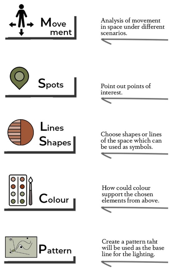 This framework constitutes a series of steps, primarily focusing on spatial characteristics, the purpose/use of the space and current lighting. Since architecture and design use elements as signs in the space, their interpretation into principles or design directions is fundamental [57].