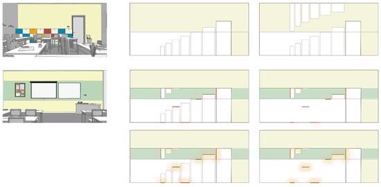 The next step in the process is the analysis of the classroom’s colour palette. Colour analysis is essential for lighting since colours’ properties, such as saturation, hue and reflectance, affect their appearance and reaction to lighting in space. For the third-grade classroom, the most used colours in space are ochre on the wall and the dark colour on the floor, followed by the green hue, which denotes the area around the board. There are also colourful lockers next to the door, the second point of interest (Figure 9).