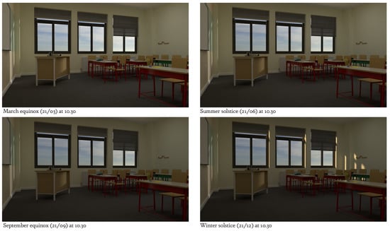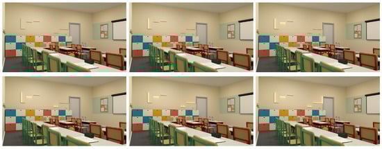 Certain limitations regarding physical tests and direct observations are in place, which require further exploration and evaluation. The set CCT was 3500 K, though it needs to be further investigated whether the colour temperature should change based on the time of day or season. Furthermore, additional testing is required to evaluate if this change is perceivable since the lights are placed in the peripheral visual field, where colour discrimination is not dominant. Another aspect that needs to be tested is the exact time frame of each transition period. An on-site experiment should be designed to test this variable. The experiment needs to focus on the appropriate interval for each lighting scenario and collect pupils’ feedback on their functionality. Additionally, the intensity of the proposed light should be further analysed in terms of contrast under different weather conditions and in relation to electric lighting. For instance, in the case of sunny weather, the sunlight is more intense, and the light transitions might not be visible. Therefore, the overall impression of the space is brighter, and the light configuration should also have a higher intensity. The contrast will not be the same on a cloudy or rainy day compared to sunny conditions. Finally, future research could involve conducting user-centric studies to evaluate the effectiveness of the proposed lighting design framework on non-verbal communication and supporting daily activities. Specifically, we plan to engage students in real-world settings where they will utilise the proposed lighting setup and provide feedback on its functionality and overall impact. Such evaluation will help validate the effectiveness of the proposed design and inform potential refinements for optimised performance in educational environments.