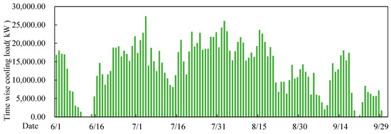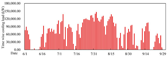 According to the simulation, the hourly cooling load distributions for both commercial and residential buildings are depicted in Figure 2 and Figure 3. The cooling period spans from 1 June to 1 October each year, totaling 122 days. The maximum cooling load for commercial buildings is 139.4 MW, and for residential buildings, it is 24.5 MW.