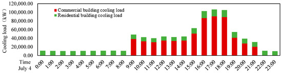 Based on the load simulation results, typical daily cooling load values are obtained. Due to the significant disparity between commercial and residential loads, the hourly cooling load on 4 July (the time of maximum cooling load occurrence for commercial buildings) is selected for further investigation; refer to Figure 4.