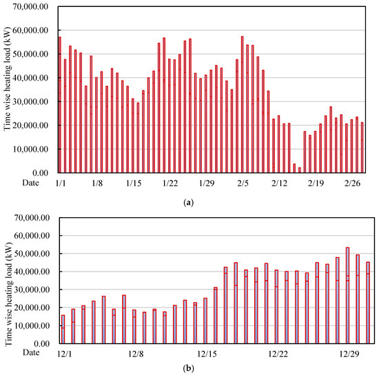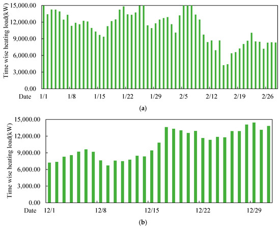 Annual daily heat load of residential buildings in the power supply area of (a) 1 January through 28 February and (b) 1 December through 31 December.