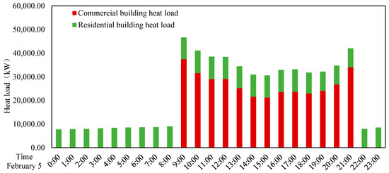 Subsequently, the load simulation results yield the typical time-down heat load value. Given the substantial difference in load between commercial and residential buildings, the time-down heat load is analyzed on February 5th, which coincides with the peak heat load occurrence for commercial buildings (see Figure 7 for further investigation).