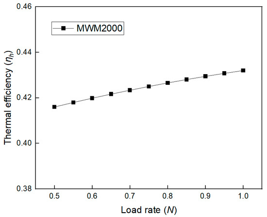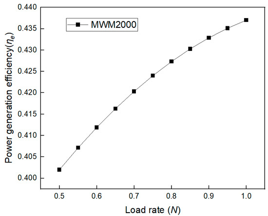 Due to the low load rate of the unit, the power generation efficiency of the unit will be reduced. In order to simplify the model, only the load rate of more than 50% is analyzed. The change in thermal efficiency ( of unit MWM 2000 with the load rate change (N) is shown in Figure 10. It can be seen that the thermal efficiency of the gas internal combustion engine decreases with the increase in the load rate of the unit. A quadratic function is fitted to the data change in the thermal efficiency ( and load rate (N) of the unit when the load rate is greater than 50% to obtain Equation (5).