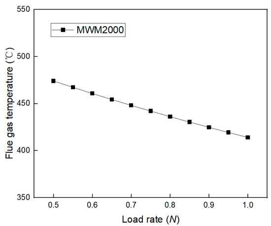 The thermal coefficient of the absorption unit is influenced by the temperature of the flue gas; therefore, a flue gas temperature model is established in this study. The exhaust temperature of unit MWM 2000 varies with the load, as illustrated in Figure 11, demonstrating a decrease as the load increases. Based on the manufacturer’s data on flue gas temperature under different loads, Equation (7) is derived.