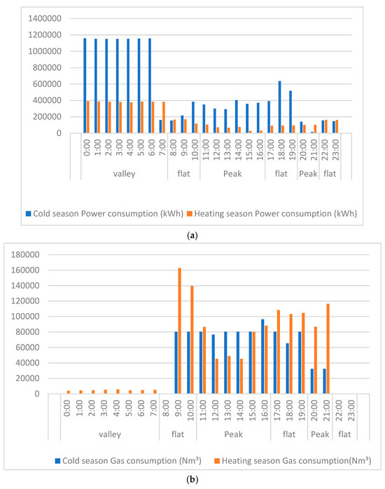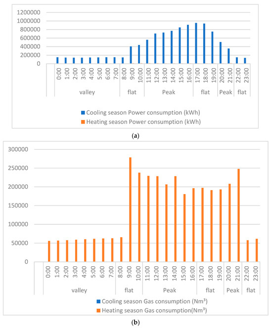 As can be seen from Figure 18 and Table 18, the gas tri-supply composite system uses gas consumption from the gas tri-supply subsystem in both winter and summer. The gas consumption of the triple-supply subsystem in winter is greater than that in summer, indicating that the heating output of the triple-supply subsystem in winter is greater than the cooling output in summer, which is due to the fact that the cooling load in summer is mainly borne by the chiller, the ice storage subsystem, and the heat pump subsystem. As can be seen from Figure 18a, electricity consumption in summer and winter is mainly concentrated in the valley phase, which indicates the obvious role of the ice storage subsystem in shifting peaks and filling valleys. Compared with the traditional cold and heat source system, even though the power consumption is greater, the operation cost is lower.