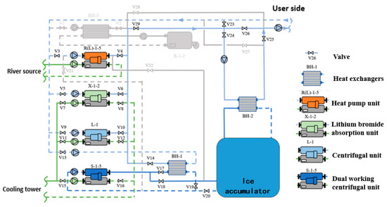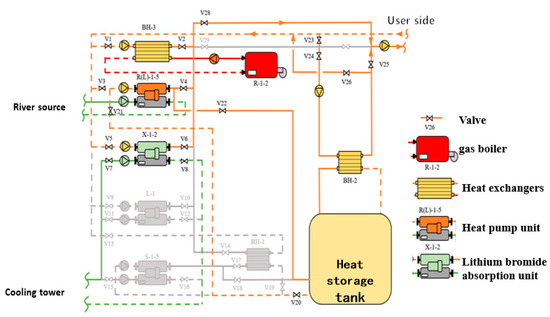 The schematic diagram of the composite system is depicted in Figure 16. During heating conditions, the gas boiler (R-1-2), heat pump unit (R (L)-1-5), and lithium bromide absorption unit (X-1-2) are capable of producing air-conditioning hot water. Specifically, the boiler generates air-conditioning hot water via the heating plate for BH-3, while the heat pump unit can store water heat during the night and produce hot water through the plate for BH-2. Initially, the hot water plate for BH-3, the heat pump unit, and the lithium bromide absorption unit operate in parallel and subsequently operate in series with the plate for BH-2.