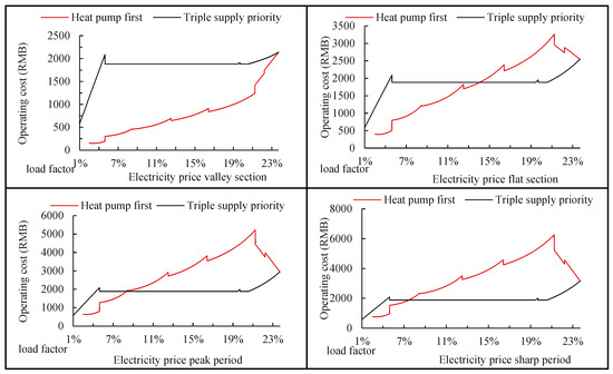 According to Figure 17, during the electricity valley price stage, utilizing the heat pump subsystem can consistently yield superior economic benefits across all load rate scenarios. During the electricity price parity phase, if the load rate is below 29.02%, then the operational cost priority favors the heat pump; however, if the load rate exceeds 29.02%, the operational cost priority shifts to the gas tri-supply subsystem. Likewise, during the peak stage of electricity prices, if the load rate falls below 19.08%, the operational cost priority favors the heat pump; however, if the load rate exceeds 19.08%, then the operational cost priority shifts to the gas tri-supply subsystem. In the electricity sharp price stage, if the load rate is below 14.78%, then the operational cost priority favors the heat pump; however, if the load rate exceeds 14.78%, then the operational cost priority shifts to the triple-supply subsystem.