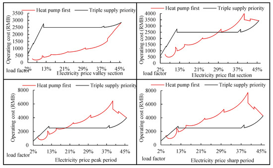 The water heat storage subsystem serves as the primary heating system. As the heat load increases, the gas tri-supply subsystem or heat pump subsystem is utilized for heating, with the gas boiler serving as a final option. Depending on the load rate and electricity price, the priority cost of the gas tri-supply subsystem and heat pump subsystem varies. Thus, a comparison is made between the priority schemes of the gas tri-supply subsystem and the heat pump subsystem at various load rates. At a heat load rate of 45.84% in the system, both the heat pump subsystem and the gas tri-supply subsystem operate at full capacity. Therefore, an analysis of the operation priority of the subsystem before reaching this heat load rate is conducted, and the relationship between operation cost and heat load rate for each pricing period is depicted in Figure 16.