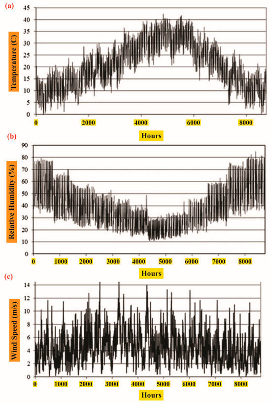 Climatic Data of Kenadsa city: (a) Monthly distribution of the outside temperature, (b) Monthly distribution of the relative humidity, (c) Monthly distribution of the wind speed [39,40].