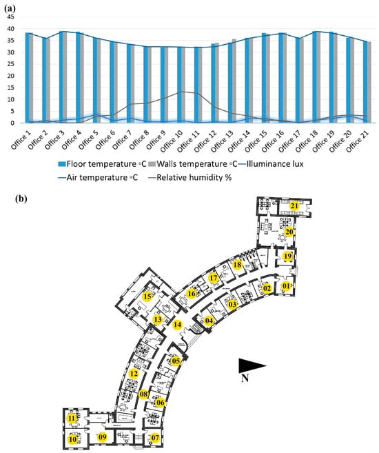 Figure 8b provides a visual representation of the location of each office within the heritage office building and its respective areas, enhancing the understanding of spatial variations in thermal conditions. These findings contribute to a comprehensive overview of the thermal atmosphere, emphasizing the impact of solar exposure and spatial orientation on indoor office spaces.