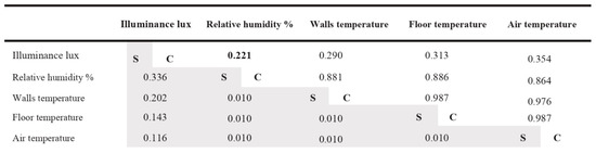 Figure 9 presents the correlations among the different physical dimensions gathered from the three office areas within our building. These dimensions aim to examine the relationship between various variables, particularly focusing on those that characterize the luminous environment, such as illuminance and the thermal environment (Ta, Tf, Tw and RH). Figure 9 shows a significant correlation between the physical dimensions. Concerning the association between the luminous and thermal environment dimensions, it is found that illuminance has strong correlations with relative humidity, with correlation coefficients of −0.212, respectively. The relative humidity has a significant correlation with the air temperature, floor temperature, and wall temperature, with a correlation coefficient of −0.864, −0.886, and −0.881 (p-value = 0.000), respectively. Moreover, it is also seen that illuminance has a significant correlation with the thermal dimensions (wall temperature with correlation coefficients −0.290, floor temperature with correlation coefficients −0.313, air temperature with correlation coefficients −0.354).