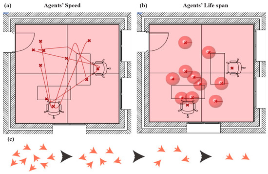 (a,b) Representation of agents’ speed and lifespan in a chosen sample office from Kenadsa’s heritage office building: (c) agent’s behaviors lifespan “disappearance”, (Arrows represent the agents’ users).