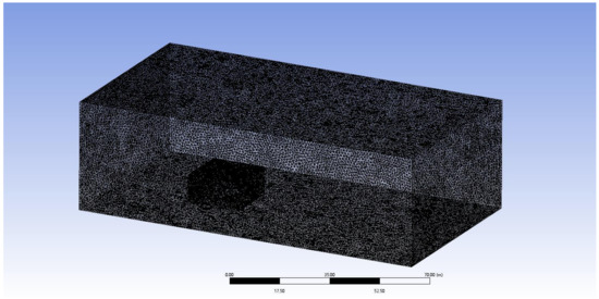 The main content of the boundary conditions includes the positional and parametric information of the boundaries, such as the inlet, outlet, symmetrical surfaces, and solid walls. The purpose of setting boundary conditions is to control the characteristics at the interface between different objects. Boundary conditions are crucial for conducting fluid–structure interaction numerical simulations, as the basic parameters set directly affect the process and accuracy of CFD numerical simulation results. The size of the computational domain is based on the tree height H, set at various multiples of the tree height. To ensure that the wind speed can fully develop within the computational domain and to balance computational cost and time, the model’s domain boundaries are set as follows: the wind speed inlet is 3H from the trees; the outlet is 9H; the sidewalls are 3H from the trees, with the entire domain height at 3H (Figure 4). Due to the irregular shape of the trees, the grid incorporates an internal section with the trees using an unstructured grid. To allow adequate computation of the airflow, local refinement is applied, with dimensions set to 70 m × 50 m × 15 m; the Mesh software (Ansys meshing) is used to generate the overall tree grid using a tetrahedral mesh type. The pulsating wind field model contains 2.25 million cells with a mesh quality of 0.86 (Figure 5).