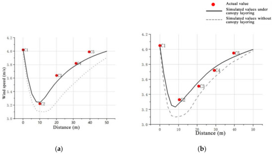 Based on the model construction and parameter settings in the previous section, numerical simulations were conducted using FLUENT software for both “without considering tree canopy stratification” and “with considering tree canopy stratification” scenarios. The simulation results were then compared and analyzed against the measured wind speed data. This study’s numerical simulation of wind speed was analyzed at 1.5 m and 5 m heights, taking the average wind speed of 20 equidistant points along the X-direction. The comparison of wind speeds in the horizontal direction between the numerical simulation results and the measured experimental wind field data is shown in Figure 8.