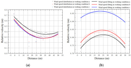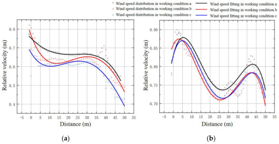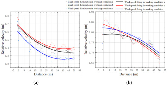 Regarding the wind speed changes in the pass-through area, all three conditions exhibited a pattern of acceleration followed by deceleration, reaching a peak near the position X = 22.5. By analyzing the maximum and minimum relative wind speeds in the pass-through area, it was found that in condition b, both values were lower than in the other two conditions, which can be specifically ordered as follows: condition b < condition a < condition c. This result indicates that condition b demonstrated the most optimal wind speed reduction effect in the pass-through area.
