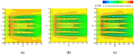 In the enclosed tree array layout, pedestrian usage areas are primarily concentrated within the enclosed space, with the surrounding trees serving mainly for wind-blocking and aesthetic purposes. Therefore, the analysis of this tree array layout focuses more on the flow field distribution in the enclosed area (−10 < Z < 10). According to Figure 13, within the enclosed area, the relative wind speed shows a clear reduction. In the front section of the tree array (0 < X < 10), due to the “channel effect” between trees, there is a certain degree of acceleration, but the trend of wind speed reduction is more pronounced compared to the other two tree layout forms. This is because there are fewer trees at the front end, leading to shorter “channels” and thus no formation of longer acceleration areas. Analyzing the flow field distribution of the three conditions, it is found that under condition a, the relative wind speed is higher compared to the other two conditions, with a wind speed range of 0.9 to 0.65. In contrast, the wind speed ranges for the other two conditions are between 0.85 and 0.6, showing a greater reduction effect on wind speed.