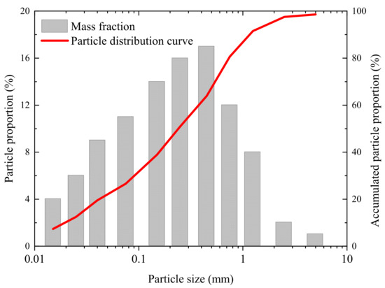 The coal gangue utilized in this investigation was obtained from a coal mine located in Jixi, Shaanxi Province, displaying a continuous and uniform particle grading (Figure 1). After crushing and sieving, the grain size distribution curve of the gangue was determined, as illustrated in Figure 1. Particles within the diameter range of 0.02–2 mm were chosen as the backfill aggregate. Experimental results indicate that the dry density of the material is 2.37 g/cm3. According to the X-ray diffraction (XRD) experiments, the main minerals of coal gangue in the study area are quartz, illite, and mica, followed by kaolinite, siderite, and dolomite. The mineral composition analysis was conducted to ascertain the chemical constituents of the gangue, revealing the presence of SiO2 (56.7%), Al2O3 (37.6%), CaO (2.1%), Fe2O3 (2.3%), and miscellaneous compounds (1.3%).