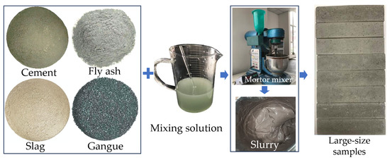 After conducting initial research, the ideal combination ratio for the backfill materials at the mining site was determined, as outlined in Table 1, with a ratio of water-reducing agent to air-entraining agent set at 2:1. Specimens were prepared following the proportions outlined in Table 1 for mechanical testing. During the preparation process, the dried gangue particles underwent crushing and sieving, with the retention of particles smaller than 2 mm. The preparation procedure of backfill samples is presented in Figure 2. Firstly, the cement, fly ash, and slag powders were proportioned as specified in Table 1. Subsequently, they were combined with gangue particles, followed by a 90 s dry mixing process in a planetary mortar mixer. A predetermined quantity of mixing solution with a concentration of 0.2% water reducer was introduced and mixed for 180 s. The resulting slurry was then poured into cylindrical molds, each measuring 50 mm in diameter and 100 mm in length, for vibration compaction. Subsequently, the molds were transferred to a conventional curing room to undergo consistent curing at a controlled temperature and humidity. After 48 h, the molds were removed, and the curing process was allowed to progress further under ambient room temperature conditions.