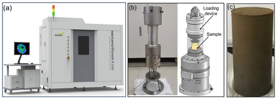 To investigate the micromechanical deformation mechanism of the cemented backfill specimens, in situ CT scanning technology will be employed for monitoring and the capturing of CT images of the specimens throughout the triaxial shearing process. Subsequently, an image processing software will be utilized for 3D reconstruction and the quantitative extraction of micromechanical parameters. The Geoscan200 geotechnical in situ CT scanning platform (Figure 3a) will be utilized, comprising a scanning system, loading system, and image analysis processing system. The scanning system is equipped with an X-ray source, scanning platform, and image detector, offering a frame capture rate of 5 fps and image resolution of up to 0.1 μm. In the study, the voltage and current for CT scanning are 120 kV and 0.5 mA. Each scanning needs an X-ray exposure time of 36 min. The pressure chamber of the loading system (Figure 3b) is constructed from aviation-grade aluminum and is furnished with various sizes of loading platforms designed for accommodating standard cylindrical specimens with diameters ranging from 20 to 100 mm and lengths from 40 to 200 mm. The loading chamber exerts pressure on the samples via a pressure control system. The execution of the experimental design pertains to the initial in situ CT scanning pre-experiment carried out on backfill specimens by the applicant. Given that smaller test sample sizes lead to increased scanning precision, mechanical testing will be carried out using samples with dimensions of 25 mm in diameter and 50 mm in length (Figure 3c). The specimen for CT scanning is carefully extracted from the large cuboid specimen (Figure 2) using precision tools and techniques to ensure minimal damage to the surrounding material.
