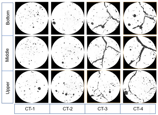 For the emphasis analysis of cracking characteristics, the 2D images of cracks within specimens were extracted from the grayscale slices (Figure 5). CT-n indicates the n-th CT scanning. By capturing images from the upper, middle, and lower sections of the specimens, the distribution of cracks exhibits inhomogeneity and anisotropy. During the compaction stage, the internal structure of the specimen of cemented backfill becomes more densely arranged, with a few small pores randomly distributed throughout the specimen and no obvious long cracks observed. In the elastic deformation stage, cracks appear at the top, middle, and bottom of the specimen. As the specimen undergoes yield deformation, compression fissure continues to expand, interconnect, and penetrate, meanwhile the width and length of these cracks significantly increase. In the residual deformation stage, there is a significant increase in the size and number of cracks, leading to improved connectivity of cracks and the formation of a complex network structure.