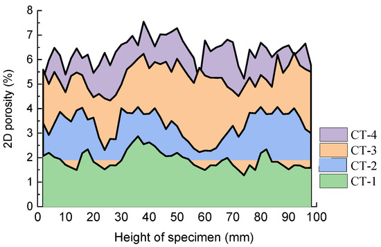 The 2D porosity at various heights of the specimen was computed using binarized CT images (Figure 6). The 2D porosity exhibits significant fluctuations along the height of the specimen under different strain conditions. The statistical analysis of the four different curves of the 2D porosity and the specimen heights reveal the upper endpoints of the curves exhibit an increasing trend with the number of scans, suggesting the vertical expansion of the destruction cracks. Statistical analysis results of the 2D CT data are presented in Table 2. With the gradual increase in axial strain, the pore areas in CFSG cemented backfill consistently enlarge. The 2D porosity, representing the proportion of pores to the total slice area, expanded from the initial measurement of 1.74% to 8.28%. The findings suggest a heightened level of structural damage to the specimen under external force. In Figure 6, along with an increase in strain, there is a corresponding increase in the variation of 2D porosity at different heights. This aligns with the observation that the statistical variance of the 2D porosity in Table 3 shows a continuous rise with the applied load. This phenomenon suggests that the application of uniaxial loading leads to a gradual increase in crack dispersion within the backfill material. Furthermore, the deformation process enhances the unevenness of the internal structure of the specimen.