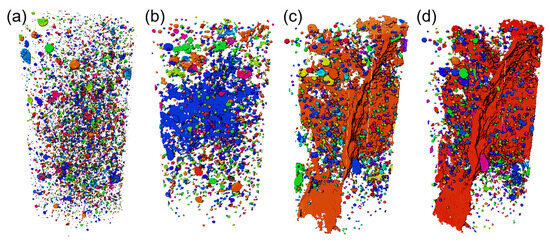 In conclusion, Figure 7 and Figure 8 illustrate a reduction in both the quantity and size of minor cracks over time, implying that the application of compression leads to the closure of small-volume cracks. The porosity of the main cracks increases significantly under uniaxial loading, indicating irreparable damage to the structure of the cemented backfill [34]. As revealed by the quantitative results of crack classification, the proportion of small cracks decreased while that of cracks with large volumes and high connectivity increased as strain increased, which is consistent with the qualitative observations from 3D crack models (Figure 7). Therefore, the 3D reconstructed models of cracks and their statistical data derived from real-time CT scanning demonstrate a favorable visualization effect and accurate evaluation, offering an intuitive, quantitative, and dynamic representation of cracking behavior, particularly showcasing the evolution of fracture surfaces within the internal space of the detected specimens [35].