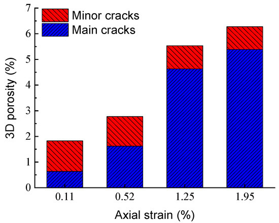 According to An et al. [27], 3D reconstructed cracks in the specimen can be categorized as main cracks or minor cracks. Main cracks are characterized by an aspect ratio exceeding five and a volume exceeding 100 μm3. On the other hand, minor cracks are more widely distributed, have smaller volumes, and do not significantly contribute to the failure process of the specimen. From a qualitative perspective, the 3D reconstructed models form the CT scanning depicted in Figure 7 illustrate that in the initial state of the specimen, there are no apparent interconnected cracks. The statistical data for the 3D porosity of minor and main cracks in the CFSG cemented backfill under uniaxial loading are presented in Figure 8. From a quantitative perspective, the 3D porosity occupied by the main cracks (0.69%) are less than those of the minor cracks (1.13%). Upon entering elastic deformation, the main cracks start to interconnect, giving rise to a different fracture surface, albeit with a relatively small volume. The 3D porosity of the main cracks increases by 123.5% compared to the compaction stage, whereas that of the minor cracks decreases by 63.8%. As the specimen undergoes yield deformation, the width and length of main cracks increase, and the fracture surface propagates from the interior outward, indicating a rapid escalation of structural damage. The 3D porosity of the main cracks sharply increases to nearly 5%, while that of the minor cracks simultaneously slightly decreases. After residual deformation, there is an acceleration in the expansion rate and connectivity of the fracture surface, ultimately leading to the penetration of the 3D model of cracks. Statistically, the 3D porosity of main cracks increases to 5.62% following external loading, while that of minor cracks remains relatively constant.