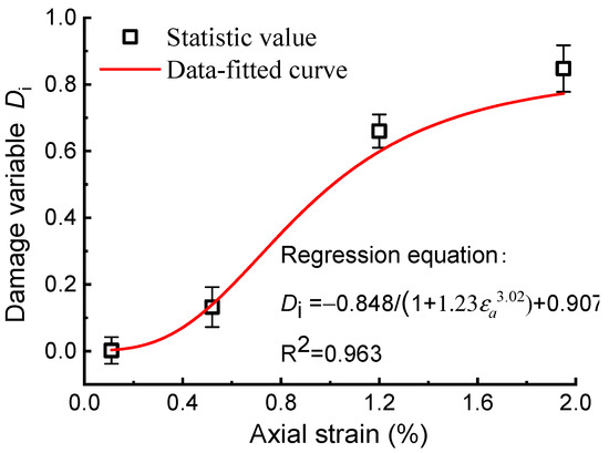 The relationship curve illustrating the structural damage variable of the backfill, calculated from 3D fracture volume and axial strain, is presented in Figure 9. According to the data-fitting equation, the damage variable exhibits a logistic function increase with axial strain. The changing rate in the damage variable initially increases slowly, then accelerates rapidly before decelerating, indicating that the structural damage primarily occurs from elastic deformation to the yielding stage and stabilizes during the residual deformation stage. As the uniaxial loading increases, the internal fracture face within the specimen gradually expands and connects, resulting in alterations to damage variables. This process culminates in the development of fracture surfaces during the advanced stages of loading, leading to substantial structural deterioration, overall instability, and eventual failure of the specimen. The evolving trends observed in the damage variable derived from 3D volume of cracks suggest that the specimen experiences gradual instability and failure as it undergoes uniaxial compression [37]. Therefore, the expansion and interconnection of the fractures serve as the inherent causes for the structural damage and failure of the backfill body.