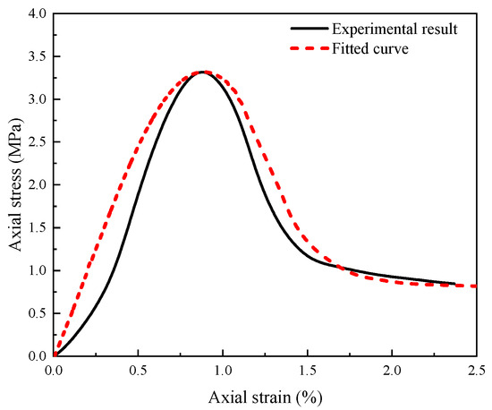Based on the linear rise and strain softening observed in the stress–strain curve, a mechanical constitutive model is proposed in accordance with the previous research [40]. The predicted stress–strain curve of the CFSG cemented backfill was obtained based on the damage variable, with the results presented in Figure 10. The fitting outcomes affirm that the aforementioned constitutive equation adeptly captures the stress–strain relationship of the specimen. This validation provides evidence for the accuracy and reliability of the constitutive model in predicting the behavior of this specific material under uniaxial loading conditions.