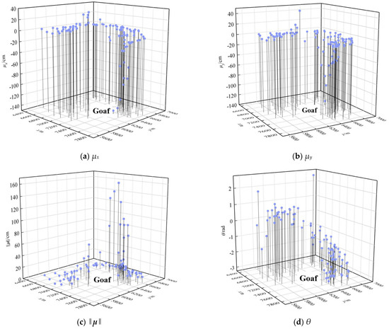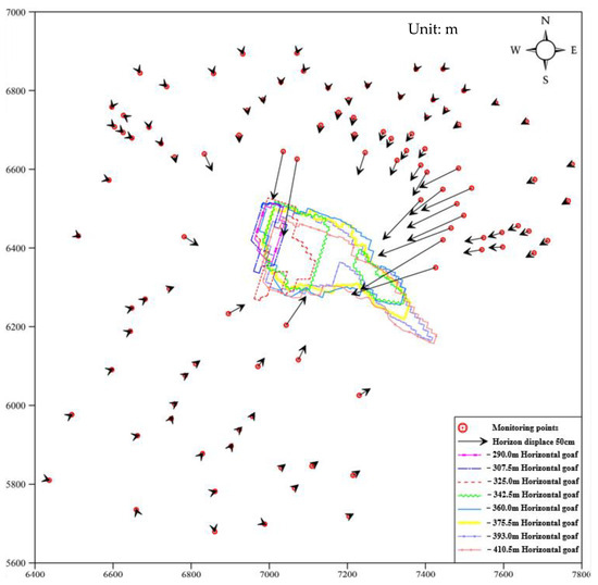 Figure 1 represents the magnitude of displacement, and the legend “−290.0 m Horizontal goaf” represents the horizontal goaf at a distance of 290.0 m from the reference point. From