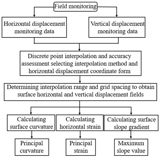 25]. However, the commonly used data processing commercial software such as ArcGIS or Surfer currently cannot directly calculate the maximum principal strain from monitoring data. Furthermore, there is little systematic description regarding the monitoring interpolation method at present. Overall, as a calculation method for surface deformation, the main advantage of the monitoring interpolation method is that it can quickly obtain the entire surface deformation field based on monitoring data, bypassing the need for complex constitutive relationships and rock mechanics parameters, and it often achieves good results [