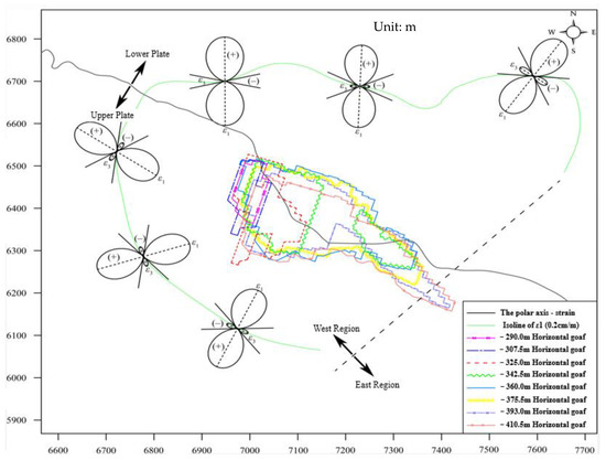 Figure 9 presents the strain polar plot of horizontal strain on the isoline of the 0.2 cm/m major principal strain. The legend “−290.0 m Horizontal goaf” in