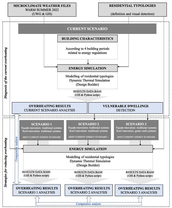 After the diagnosis, three scenarios for retrofitting the envelopes of dwellings are developed as strategies to reduce overheating. For this purpose, different types of thermal envelopes are defined, both with traditional systems and with the inclusion of nature-based solutions (NBS). After that, the models of residential typologies were parameterized and simulated, and the results were linked to the actual city sample, focusing on the dwellings previously identified as the most vulnerable. Finally, the results of the retrofitting scenarios were compared with the current state to quantify the improvement of dwellings in relation to indoor overheating.