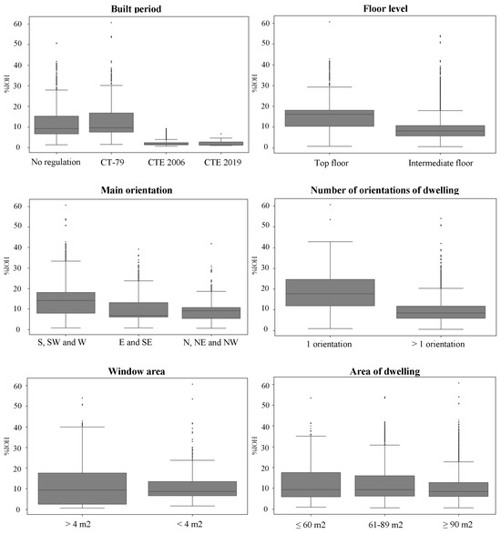 First, a comparative box plot of the %IOH of each category within parameters, is shown in Figure 3. This is a descriptive analysis that shows the distribution of the data and the comparative trend between the categories of each exposure variable. The graphs show that most of the categories present an average %IOH greater than 10%. The highest %IOH values are when the dwellings are grouped according to the “number of orientations”, specifically in the “one orientarion” category (19.2 %IOH on average); the lowest values are when the dwellings are grouped by the built period in the built periods after CTE 2006 (2.9 %IOH on average).