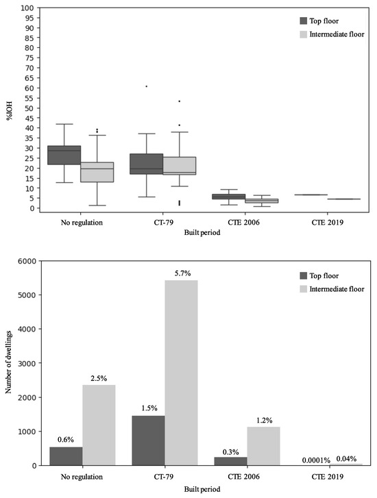 Figure 5 shows the analysis of representativeness and %IOH within these residential typologies (12, 13, 34): the highest difference in %IOH between dwellings located on the intermediate floor and on the top floor is in the no-regulation period, as they do not have thermal insulation in the roofs. In the CT-79 period, although the thermal insulation in roofs is low, the difference in %IOH between floors is significantly reduced. The dwellings built after CTE 2006 have a significant reduction in %IOH, with values around 5% of IOH, despite having only one orientation.