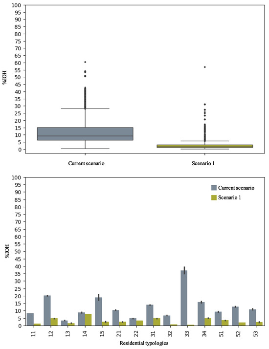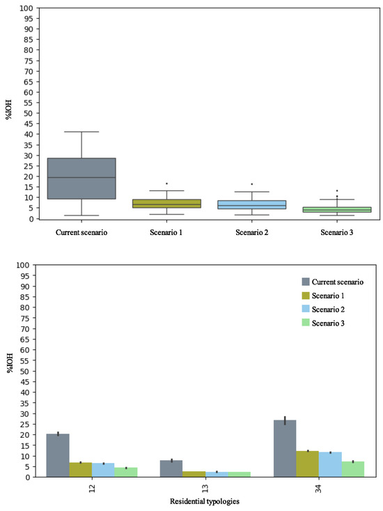Results of %IOH in Scenario 1 (residential buildings built before CTE 2006 have improved envelopes to meet the standards required by the current energy regulations in Spain) applied to Pamplona (Spain): intermediate floor (top); top floor (bottom).