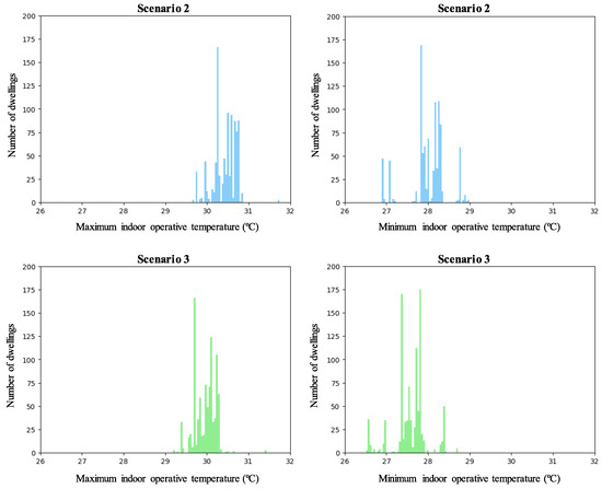 After Scenario 1, with all dwellings complying with the Spanish Technical Building Code (2006 or 2019 version), two specific scenarios were proposed for the dwellings detected as more vulnerable to suffering higher overheating (i.e., dwellings with one orientation located on top floors):